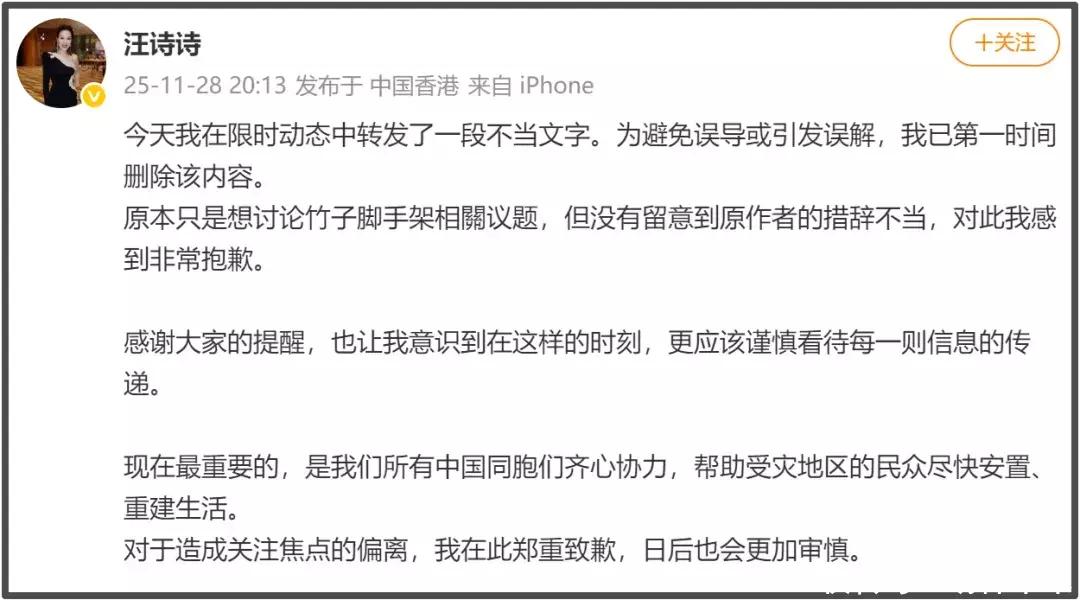 香港火灾令人揪心与痛心,娱乐圈的明星纷纷捐款助力,尽己所能帮助受灾者早日重建家园。在这样一个众志成城,守望相助的时刻,甄子丹老婆汪诗诗却转发了一条英文INS,内含不当言论。虽然在舆论发酵之后,她迅速删除动态并道歉。可惜,网友却并不买账,甚至更加愤怒。
